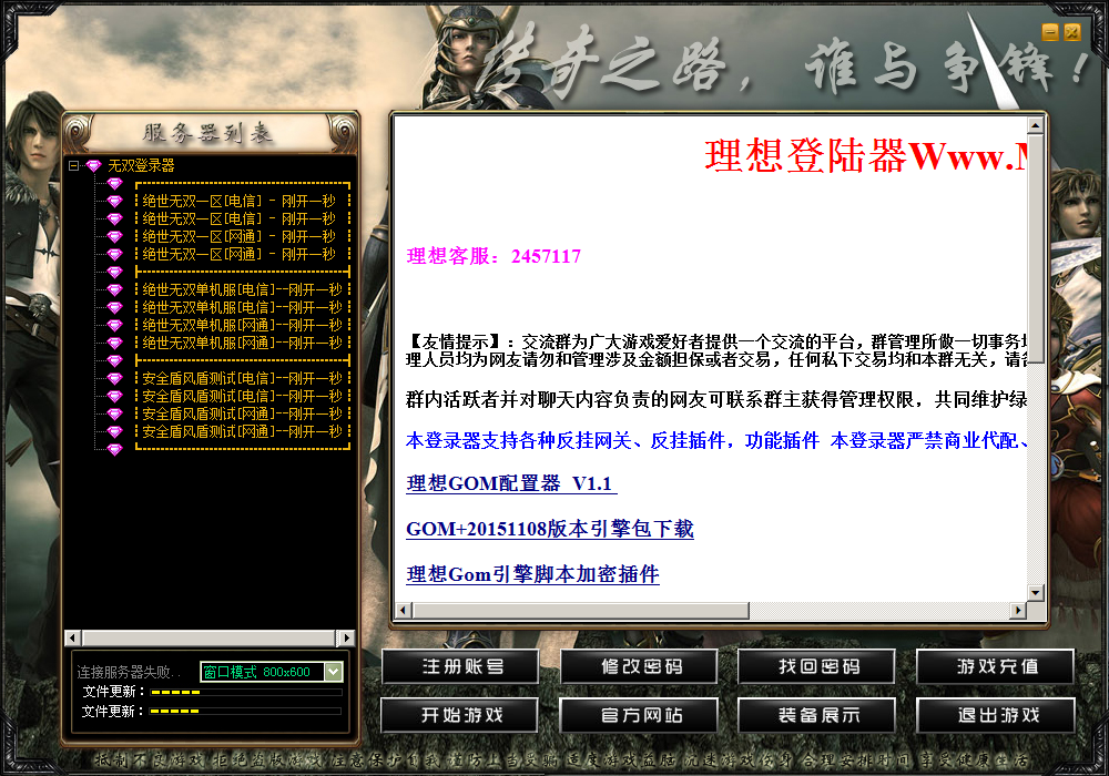 理想客服:2457117 【特别说明】:用户中心目前开放Gom登录器配置 可在右上角进入用户中心查看 【友情提示】:交流群为广大游戏爱好者提供一个交流的平台,群管理所做一切事务均为本程序无关,管理作用为清理发布违法、违规信息人员,因管理人员均为网友请勿和管理涉及金额担保或者交易,任何私下交易均和本群无关,请各自提高警惕防止上当受骗! 群内活跃者并对聊天内容负责的网友可联系群主获得管理权限,共同维护绿色交流环境! 本登录器支持各种反挂网关、反挂插件,功能插件 本登录器严禁商业代配、严禁捆绑恶意劫持插件代配等