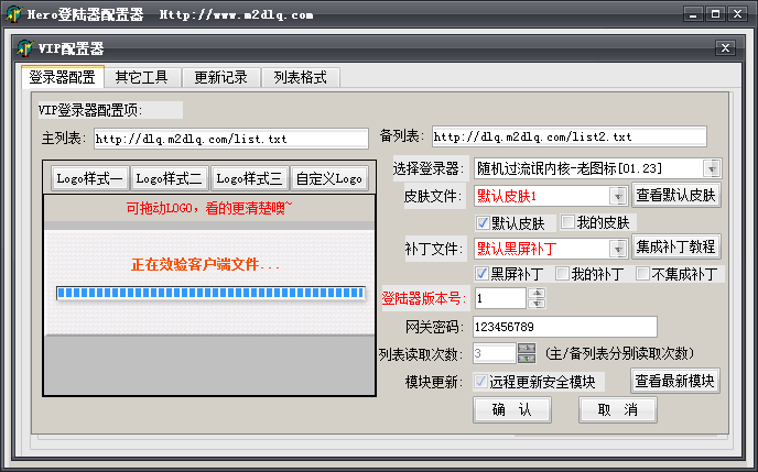 系统默认皮肤展示【可在配置器内使用工具查看】 简易配置教程↓ 如图一:登陆后选择需要配置的列表 如图二:设置好自己的参数,即可点击确定按钮来生成登录器了。